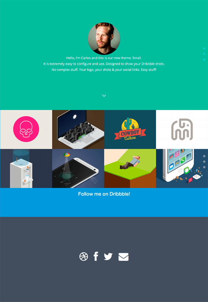 Small is a little theme focused in your latest dribbble shots. Thanks to the jibbble script, this theme allows you to show 8 shots on the front page. Works excellent as a vCard option.